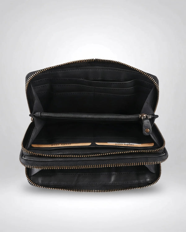 Die „Serena“ bietet mit ihren 8 Kartenfächern ausreichend Platz, um Kreditkarten, Ausweise und andere wichtige Karten übersichtlich und sicher zu verstauen. Das separate Handyfach ist speziell konzipiert, um Ihr Smartphone sicher und griffbereit zu halten, während das Hartgeldfach mit einem Reißverschluss die Sicherheit Ihrer Münzen gewährleistet.